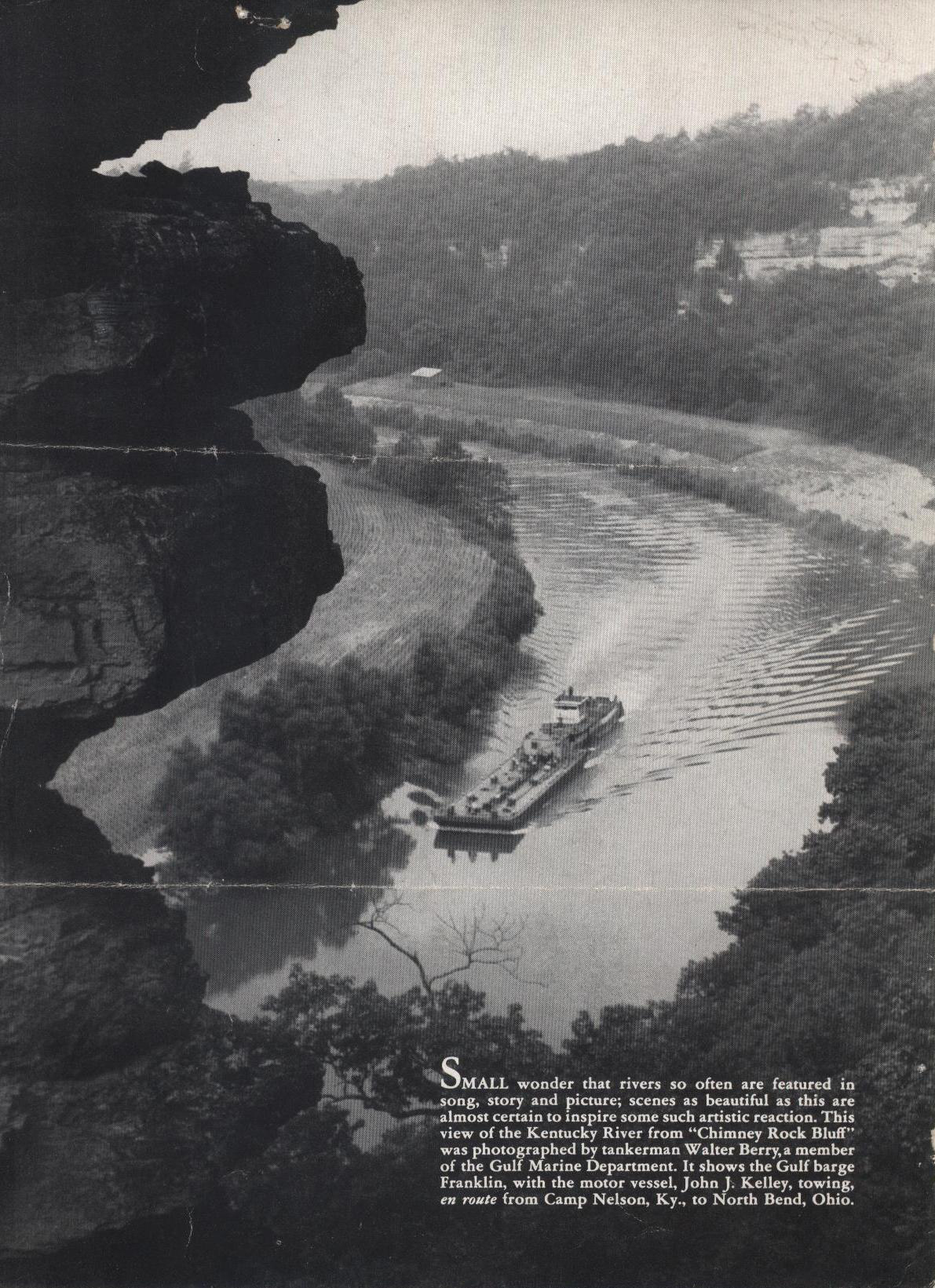 The John J. Kelly on the Kentucky River at “Chimney Rock Bluff” (Published in a Gulf Oil company magazine)